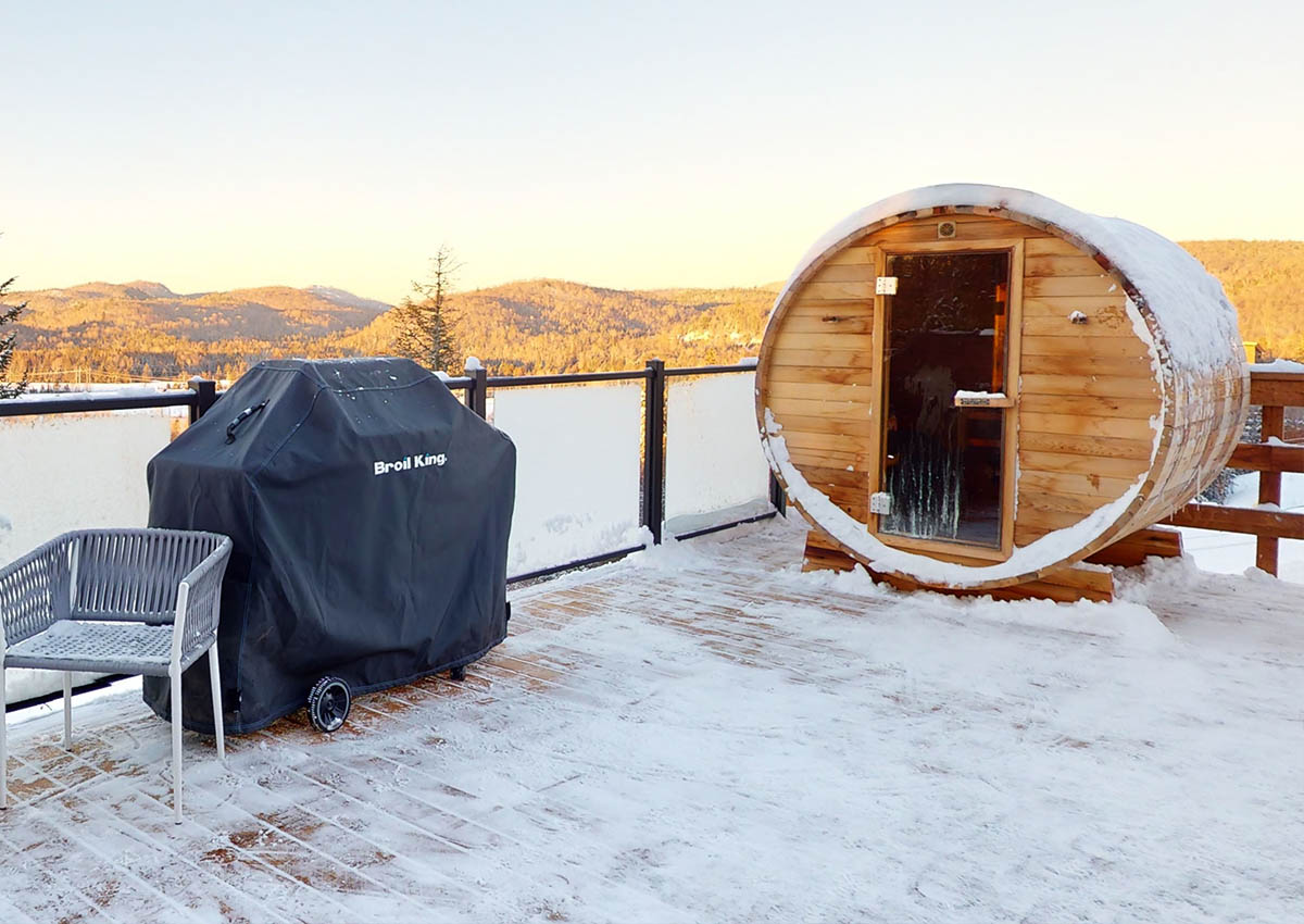 Dehors, il y a une terrasse avec un barbecue, une table et deux chaises, un jacuzzi et un sauna privés.