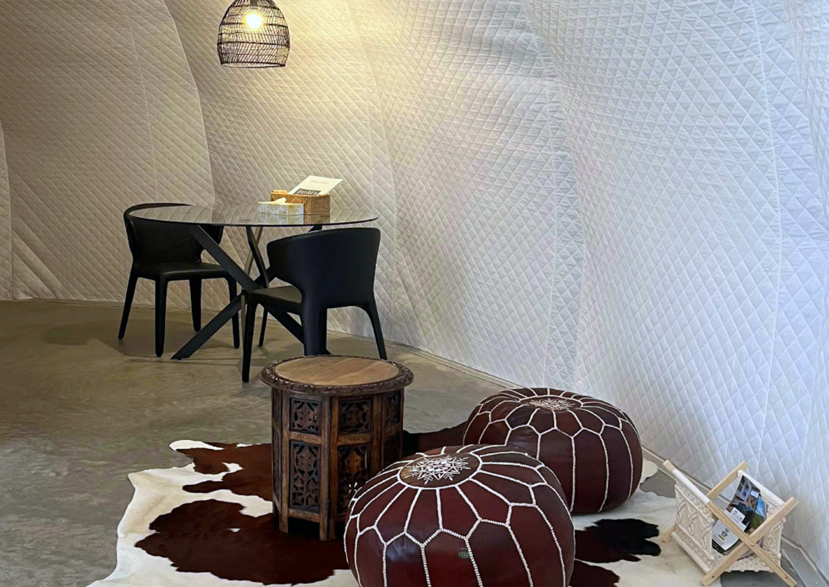 Le Snail Dome est lumineux et dispose d’un espace de vie spacieux ouvert avec une kitchenette entièrement équipée et une table à manger pour deux personnes. Le lit king-size fait face à une grande fenêtre avec une vue spectaculaire sur les montagnes. Derrière le lit se trouve un coin salon confortable, d’inspiration marocaine, où vous pourrez vous détendre avec un livre ou un verre de vin.