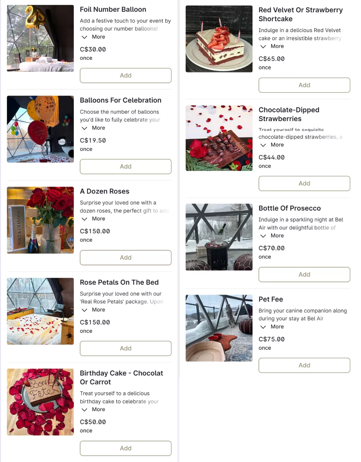 Bel Air Tremblant also offers three additional rate packages with each of our units. This includes a Bed and Breakfast package, Birthday celebration package or the “Marry Me’ package.