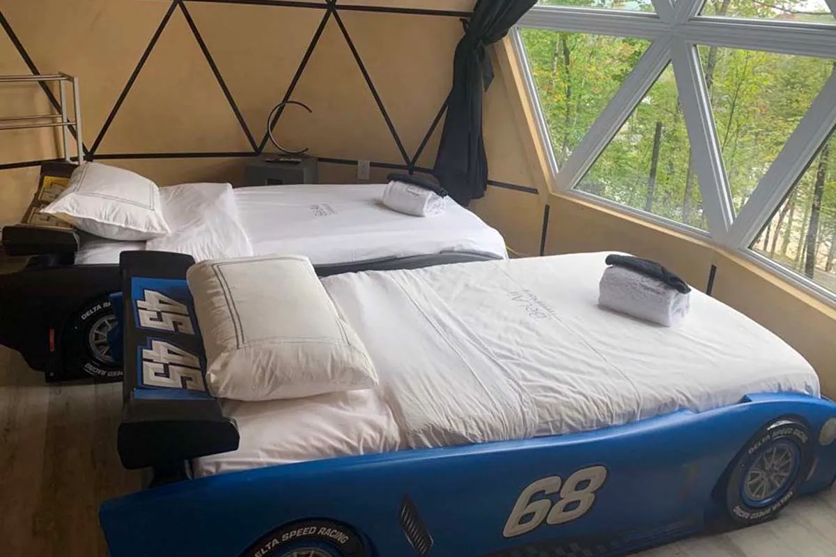 The Triple family dome rental made up of three dome shaped living spaces which includes two bedrooms separated by a third dome. This center dome has a kitchenette, table with chairs and a half bathroom.