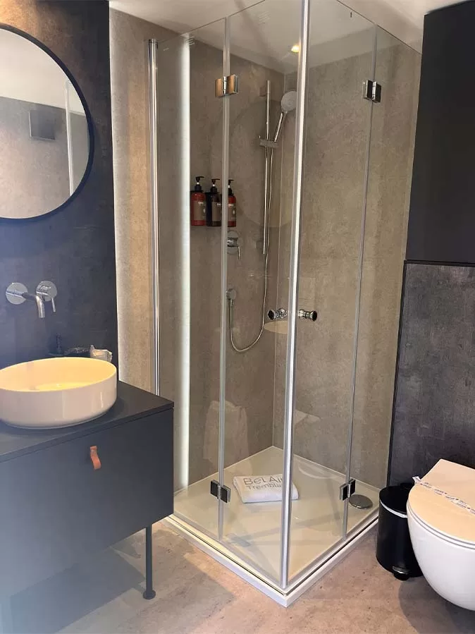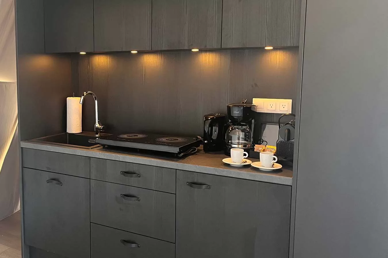 The Deluxe Instagram Dôme features a cozy open living space with everything you need. In the center of the dome is a large king-size bed, cozy sofa, Smart TV and a gas fireplace. To the left of the bed is a small kitchenette and across from the fireplace is dining table and two chairs. Behind the bed on the right is a bathroom with a shower.