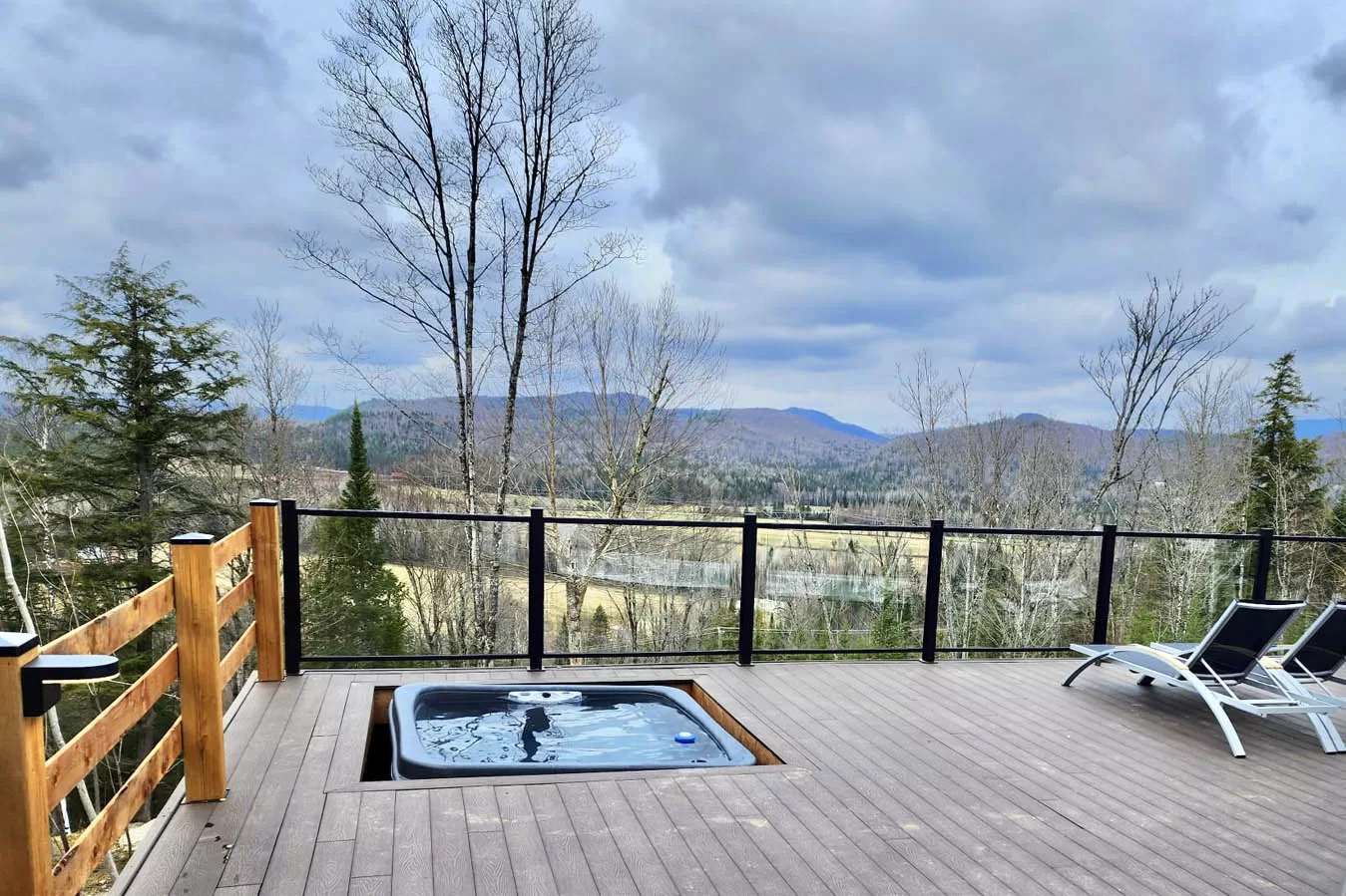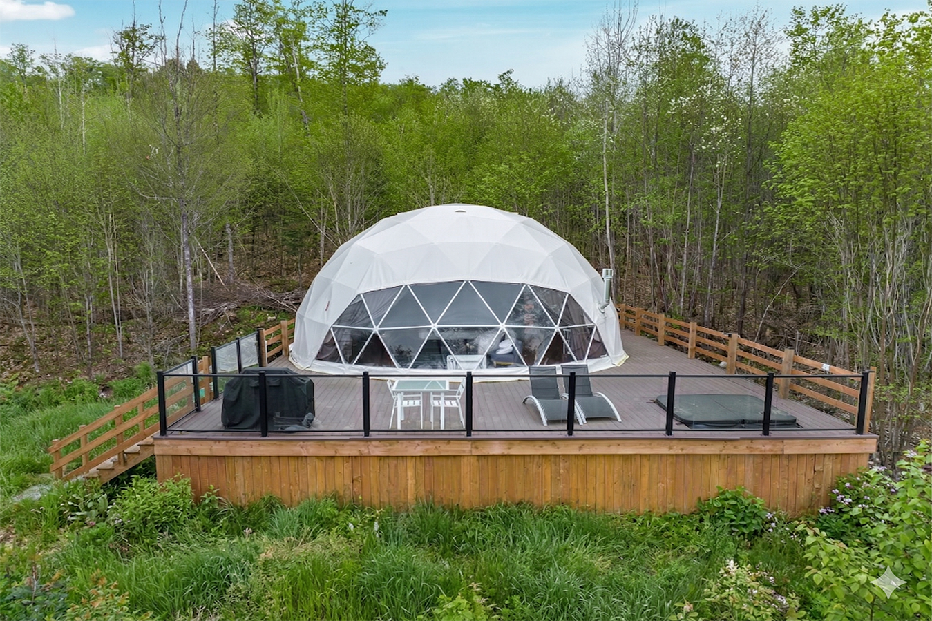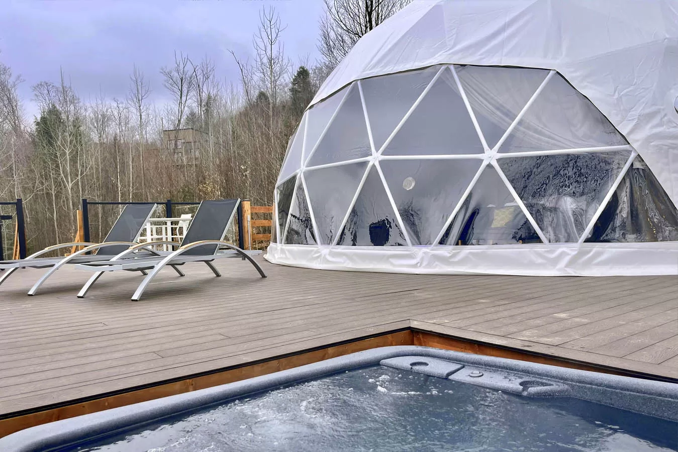 A large pane window provides a wonderful panoramic view of nature from nearly every angle of the Deluxe Dome 5. Step outside onto the wood deck and relax in a lounge chair or stargaze from the private hot tub.