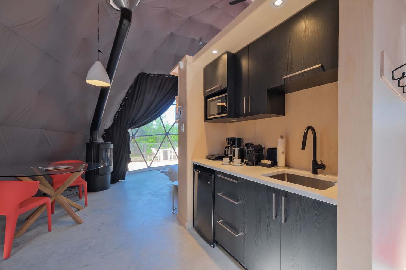 The Deluxe Dome rentals feature an open kitchen area with a dining table for two. The bedroom has a king-size bed, gas fireplace and a sofa so you and your loved one can relax after a day of pampering. Next to the bed is a stand-alone bathtub and hidden behind a partition is the bathroom vanity sink, shower and toilet. A large bay window provides beautiful views of the surrounding nature.
