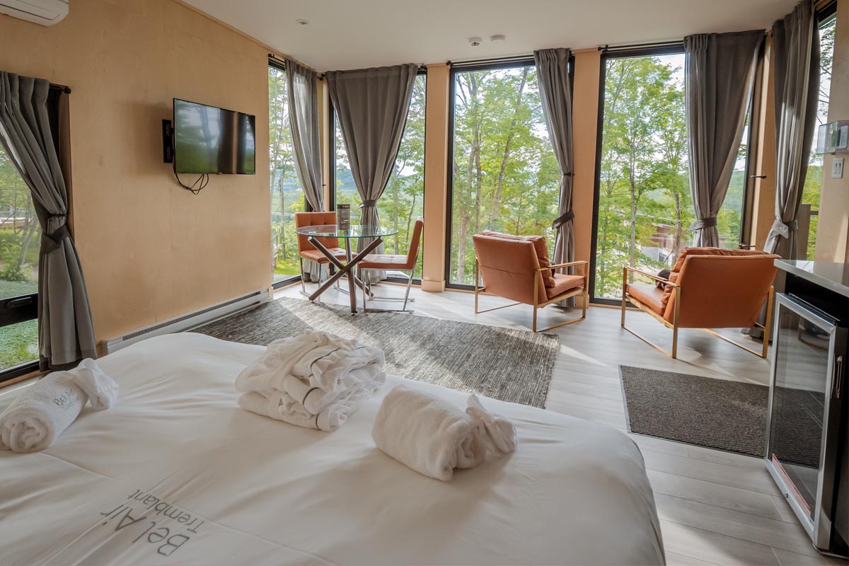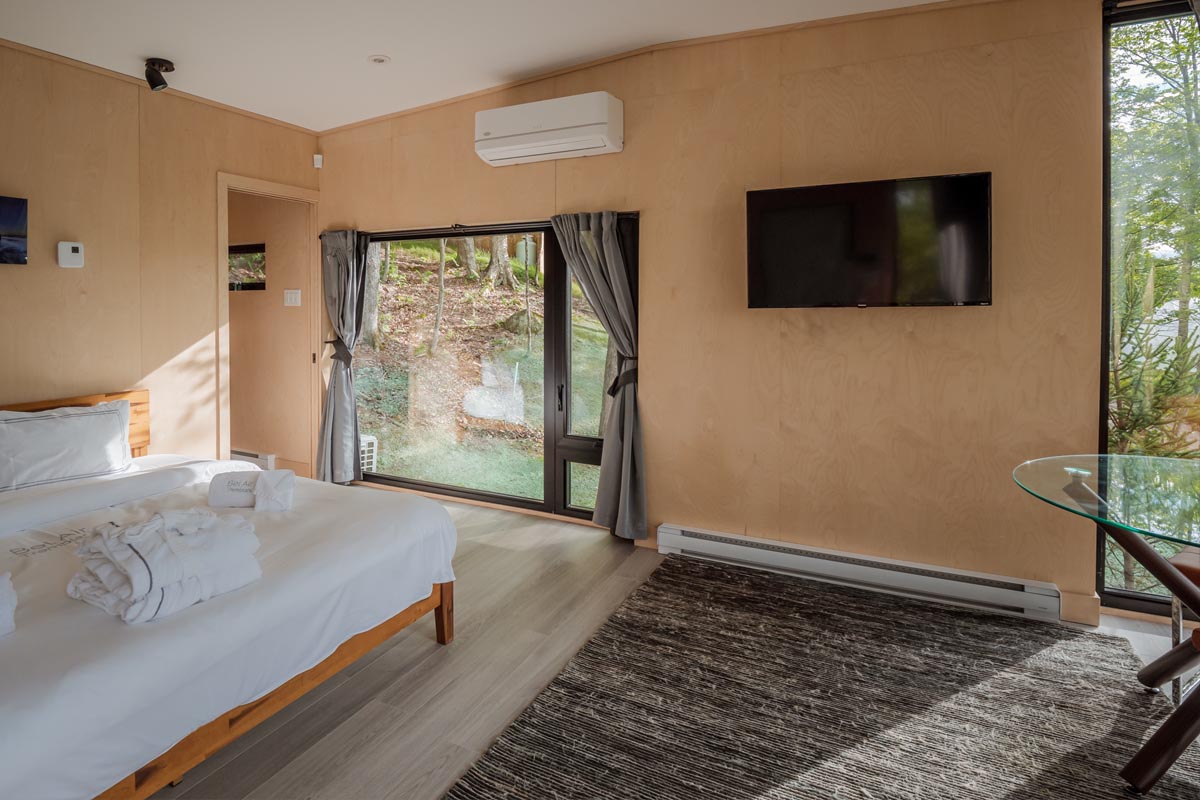 This modern Tremblant tiny house rental has an open floor plan which is bordered by an entire wall of floor to ceiling windows. In the middle of the room is a plush king-size bed with direct views of the surrounding landscape.