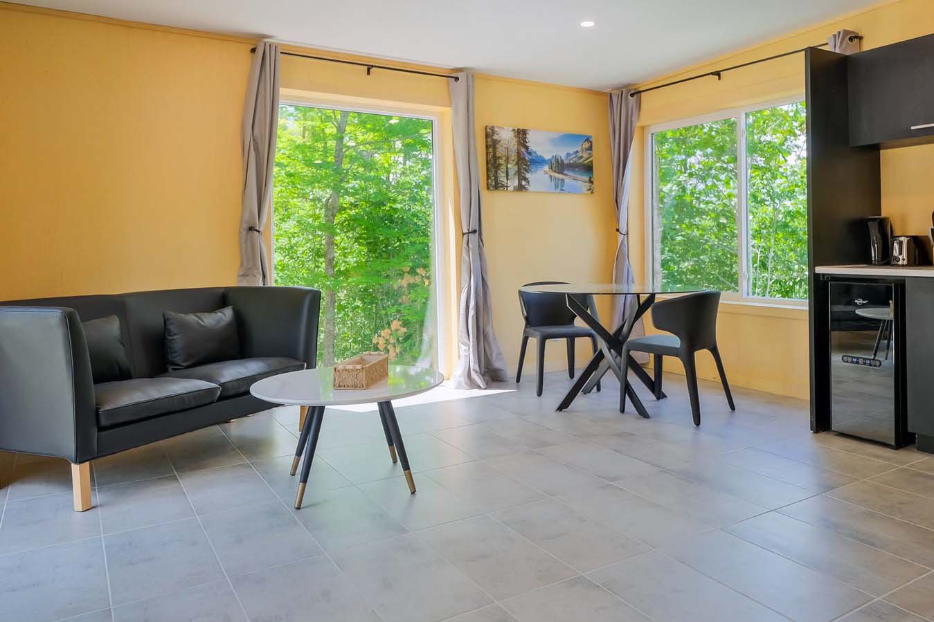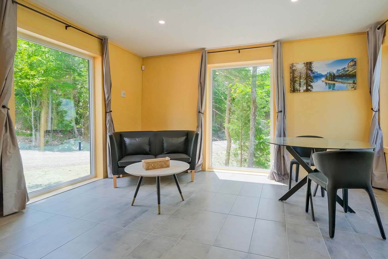 The living room is open with a very comfortable sitting area which offers a direct view of the beautiful surroundings through three large glass windows. The kitchen area is full-equipped and includes hotplates, refrigerator and everything you need to prepare a meal. In the middle of the room is a dining table and two chairs.